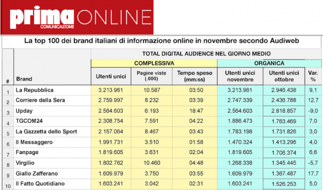 E’ il dato rilevato da Audiweb nel mese di Novembre pubblicato da "Prima comunicazione". In Toscana QUInews si conferma prima testata nativa digitale