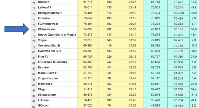 Un inserimento in una graduatoria dove compaiono in gran parte testate nazionali ma dove QUInews, pur parlando solo di Toscana, ha trovato spazio appena dopo giornali come "La gazzetta del mezzogiorno" e "Il Tempo" e sopra riviste come "Vogue" e Cosmopolitan.