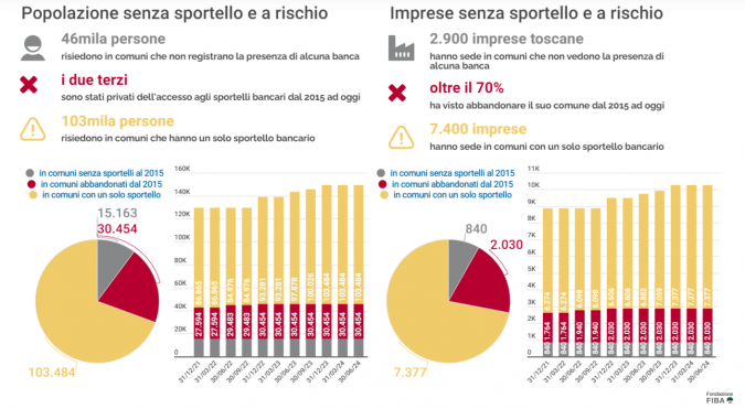 A rischio però ce ne sono altre 7.400 attive in territori comunali con un solo sportello, accompagnate da 103mila toscani in quella stessa situazione.