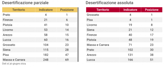 E la Toscana rispetto allo scenario nazionale non è fra le regioni peggio messe, visto che tra le province meno desertificate d'Italia figurano Grosseto e Pisa.
