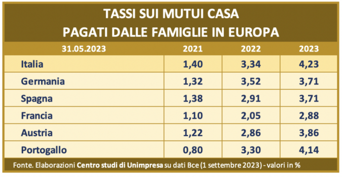 Condizioni decisamente più favorevoli Oltralpe: "In Italia c’è una differenza di 52 punti base rispetto a Germania e Spagna (3,71%), di 135 punti rispetto alla Francia (2,88%), di 37 punti rispetto all’Austria (3,86%) e di 9 punti rispetto al Portogallo (4,14%)".