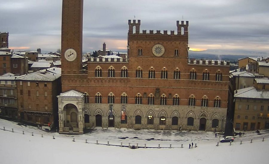 Piazza del Campo si è vestita di bianco, scuole chiuse. In Toscana minime fino a -12 gradi. Mezzi operativi sulle strade, diramata l'allerta ghiaccio
